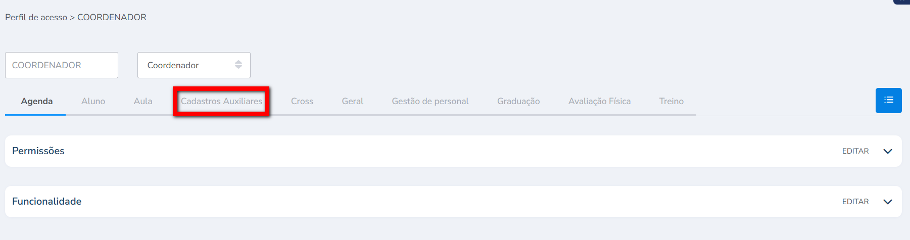 3. Na guia “Cadastros Auxiliares“, clique em “Permissões” para expandir as permissões;
