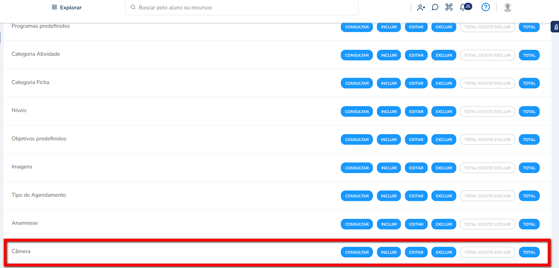 - Total sem excluir: permite consultar, incluir e editar as câmeras;