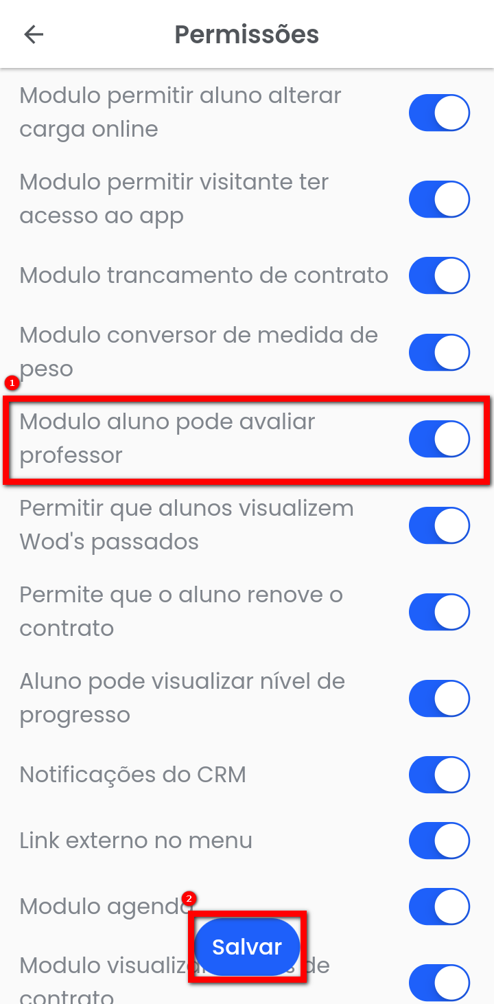 A avaliação é lançada pelo próprio aluno, da carteira do professor, através do aplicativo Pacto Treino. No aplicativo Pacto App, é possível conceder essa permissão para que o aluno possa avaliar o seu professor.