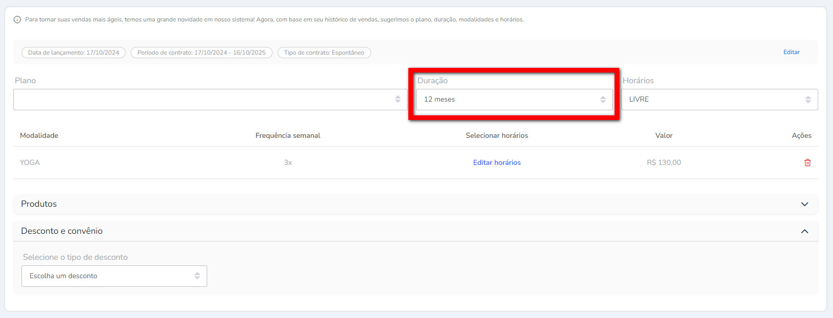 Atenção: as durações para serem apresentadas devem ser configuradas no cadastro do plano.