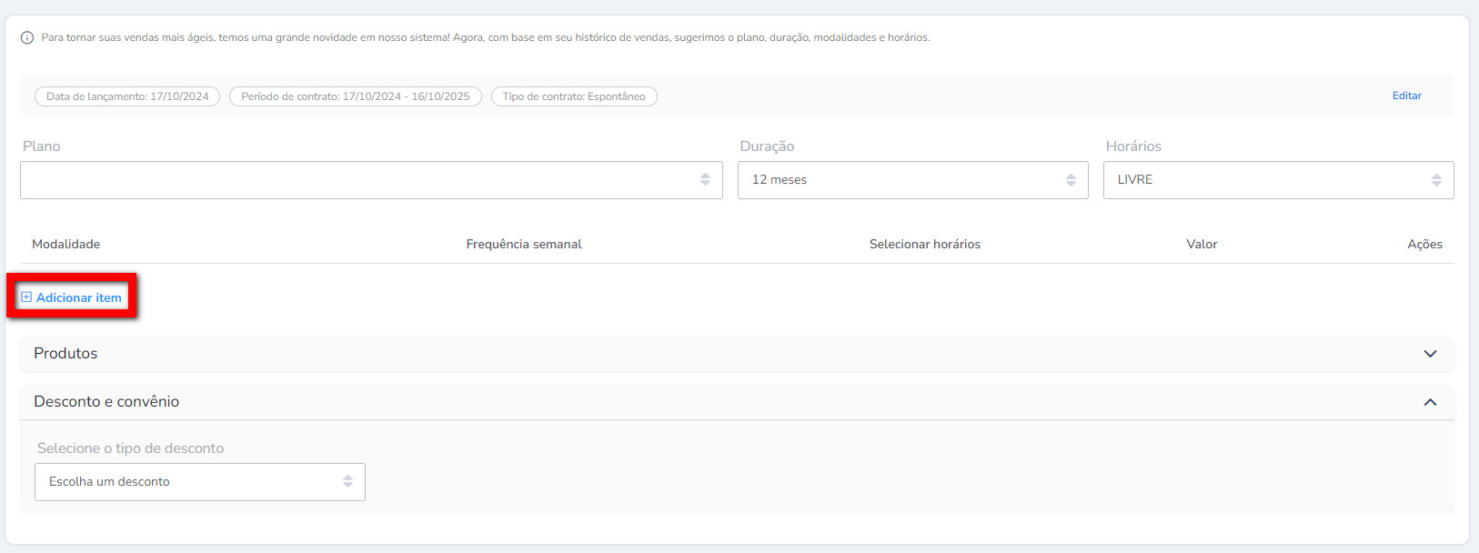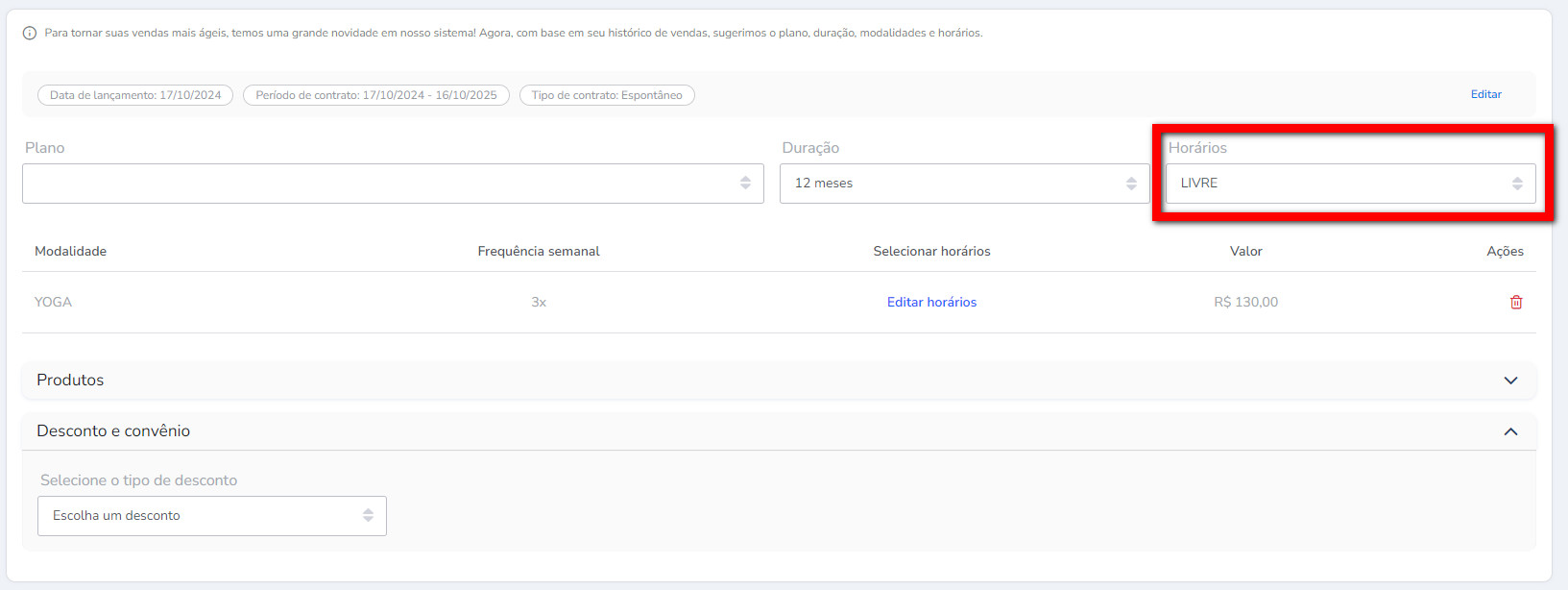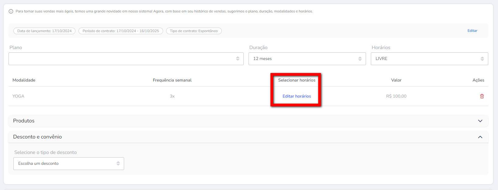 Atenção: os horários para serem apresentadas devem ser configuradas no cadastro do plano.