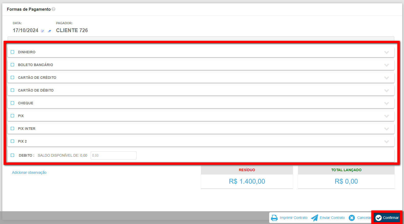 6. Será aberto a tela de formas de pagamento, selecione a forma de pagamento que o cliente realizou e clique em "