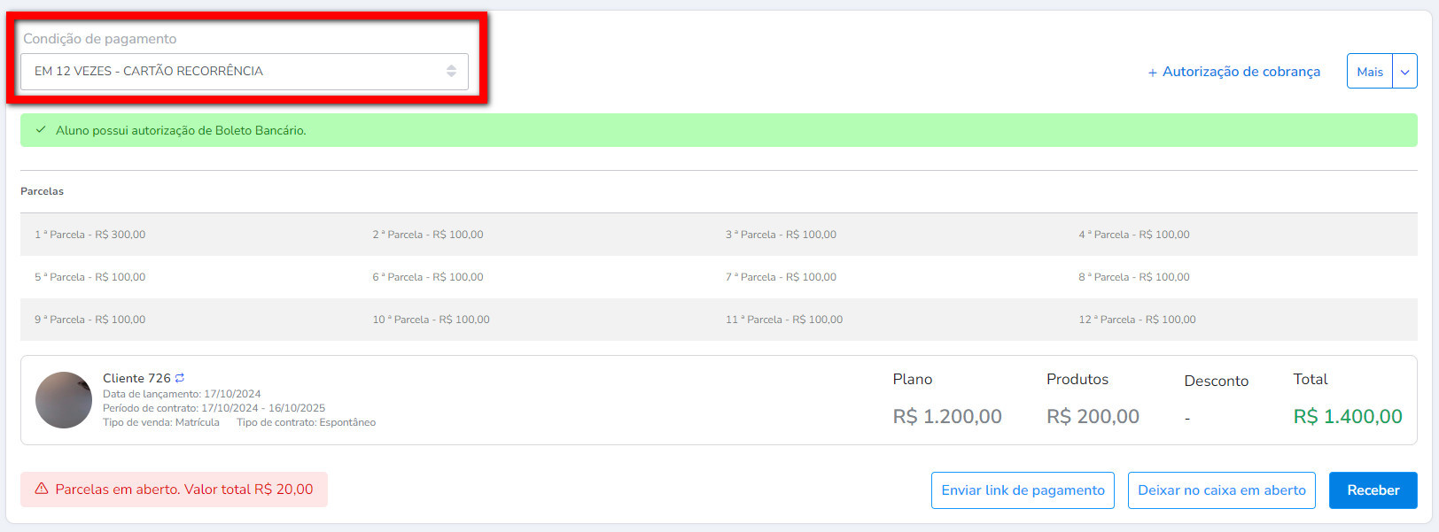 - Deixar no Caixa em Aberto: nesta opção pode deixar as parcelas no caixa em aberto do cliente;