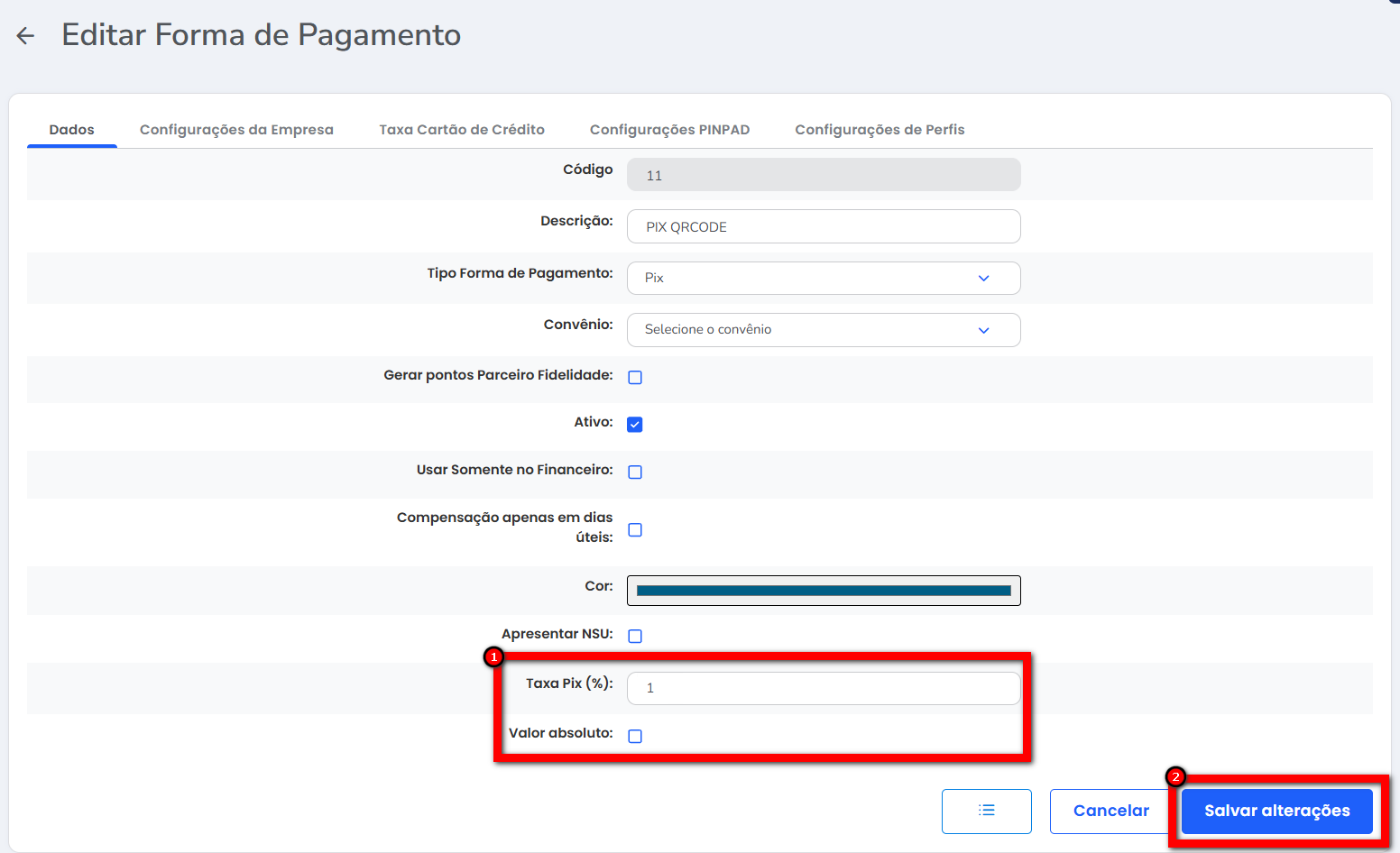 Este recurso permite cadastrar as taxas de PIX para facilitar o cálculo do valor líquido dos recebíveis.