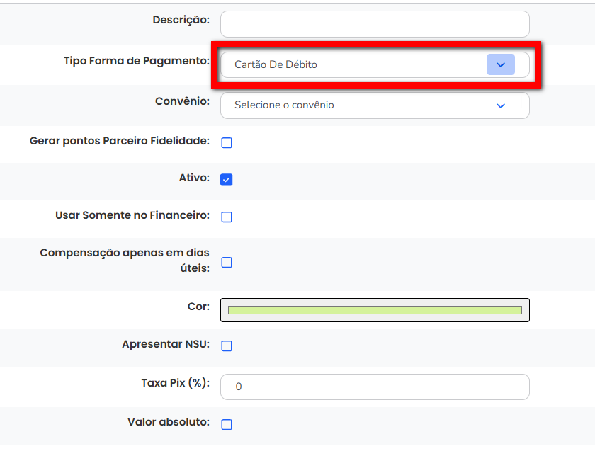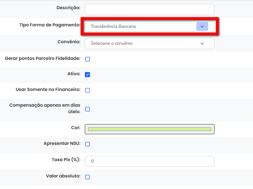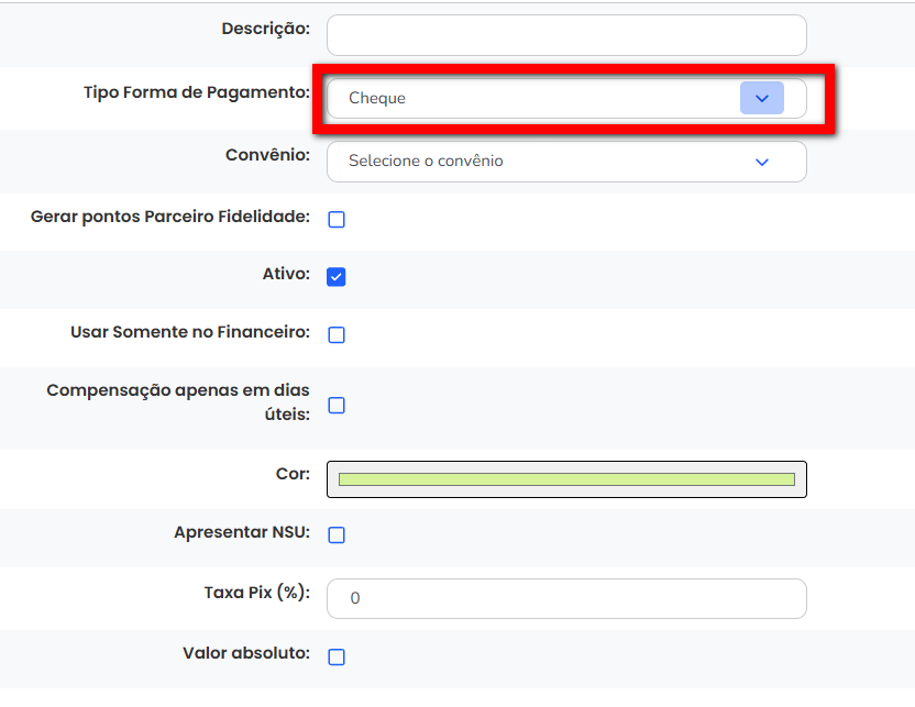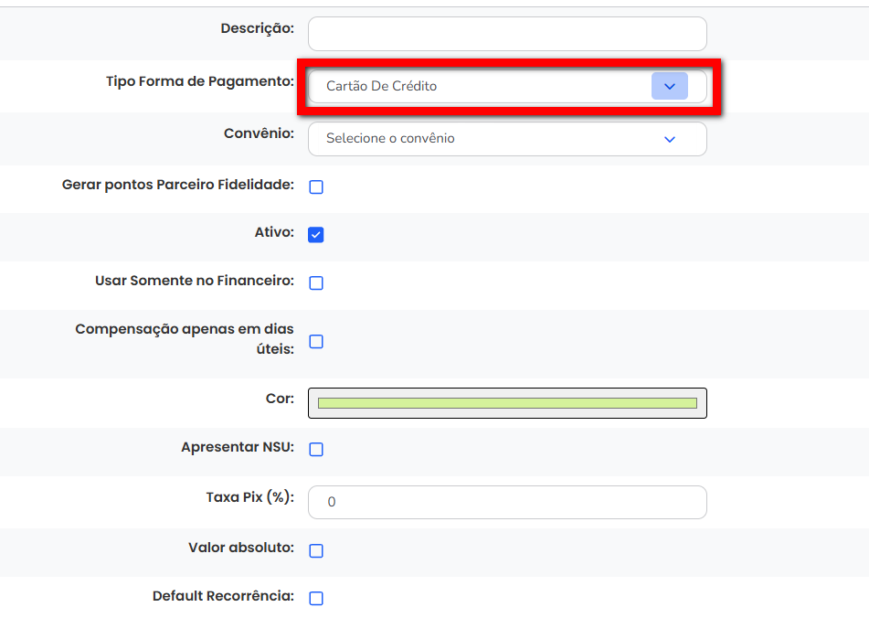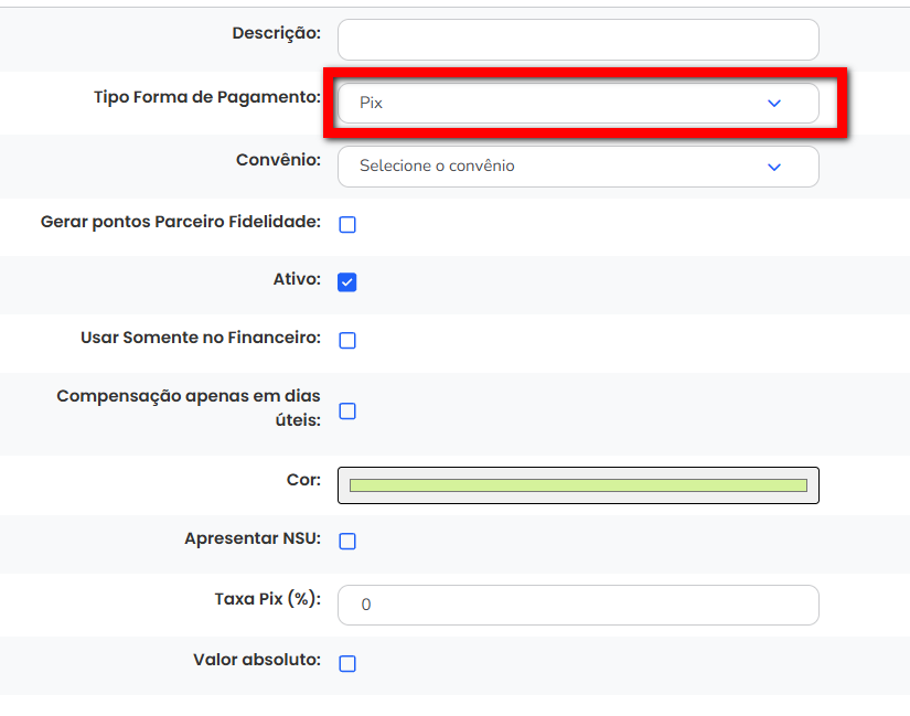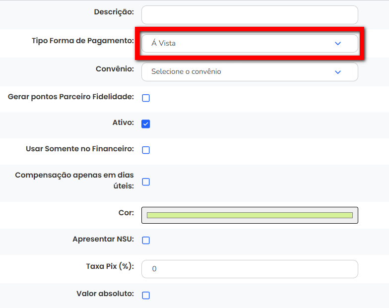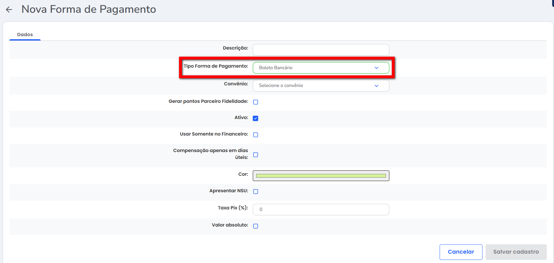 - Convênio: caso queira vincular essa forma de pagamento a um convênio;