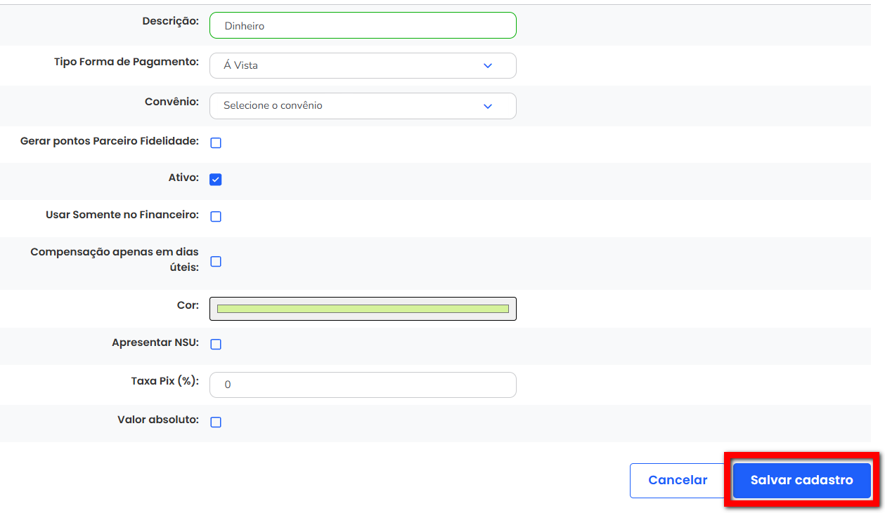 - Usar somente no financeiro: marque essa opção se essa forma de pagamento só poderá ser utilizada nas operações do módulo financeiro;