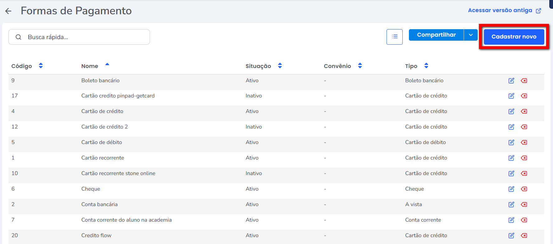 A forma de pagamento é um cadastro essencial, pois define os meios que o aluno poderá utilizar para pagar planos e produtos. Entre as formas mais comuns estão: Dinheiro, Cartão de Crédito, Cartão de Débito, Cheque, Boleto e PIX.