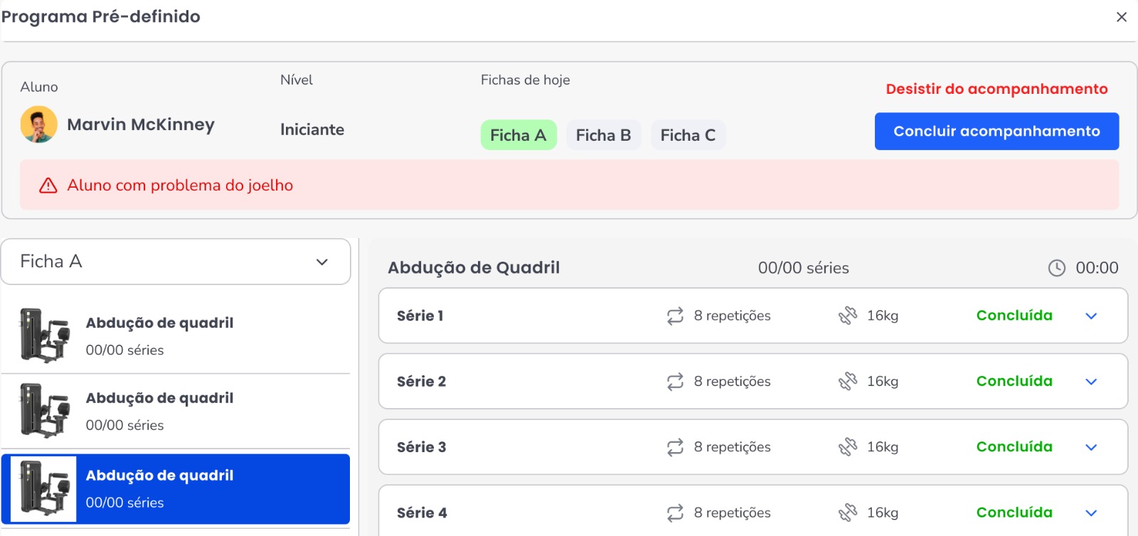 Ao concluir todas as atividades da ficha, o sistema identifica automaticamente e finaliza o acompanhamento daquele aluno, sinalizando no histórico que o treino do dia foi executado com sucesso!