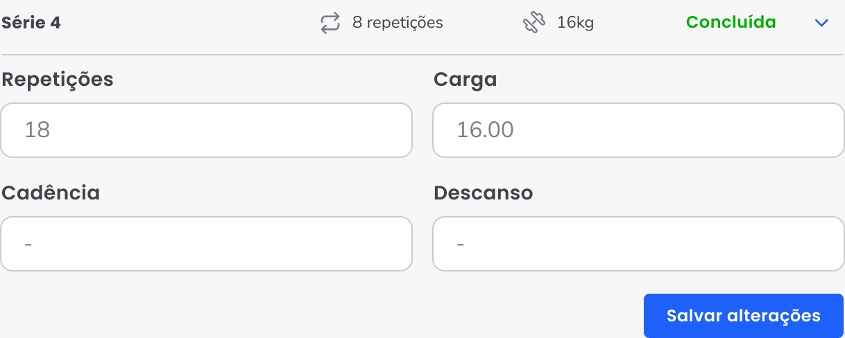Imagine esse cenário: o professor inicia o acompanhamento da aluna Alicia na atividade “Remada Curvada com Halter”. Ele conclui cada série no sistema e, quando finaliza todas, o sistema registra tudo no histórico dela — sem precisar voltar e digitar depois.