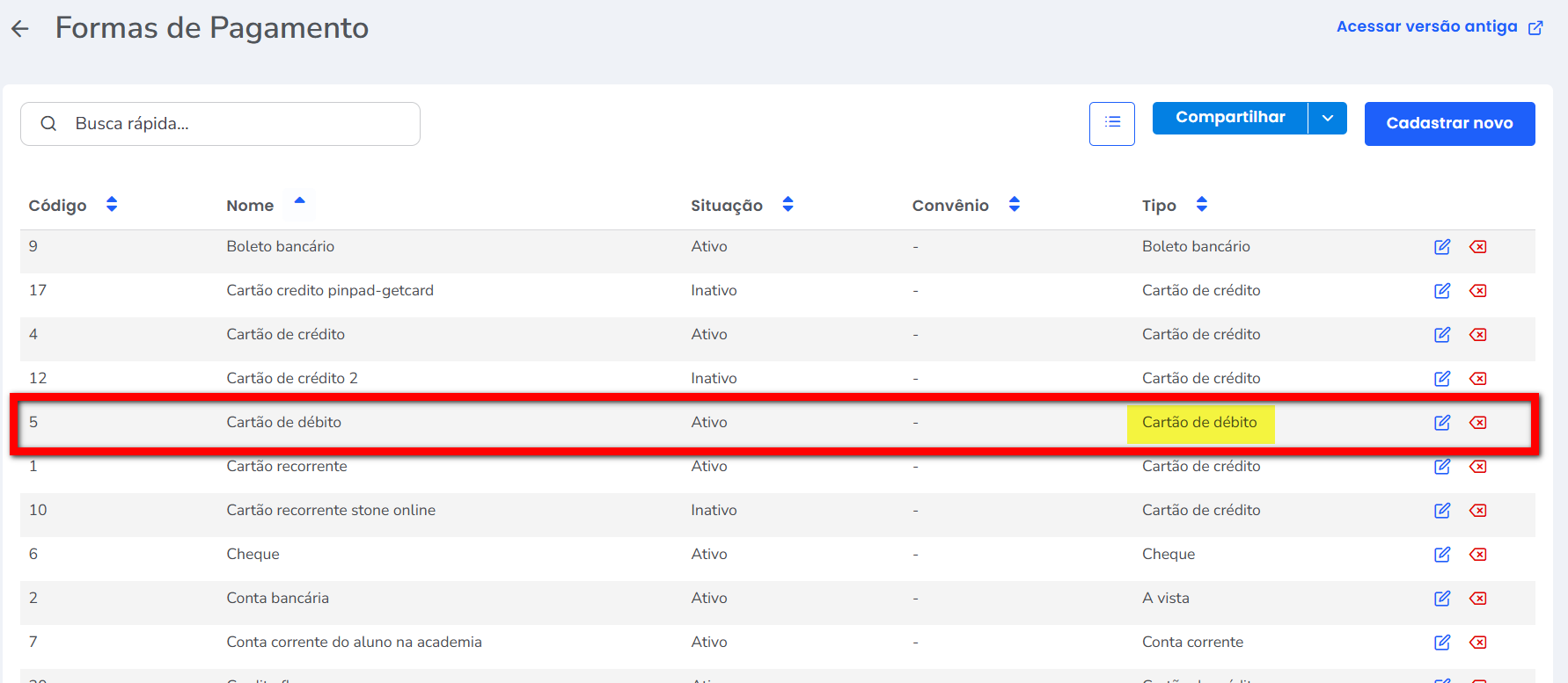 2. O sistema abrirá uma nova guia com as formas de pagamento cadastradas;