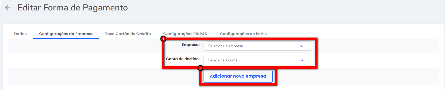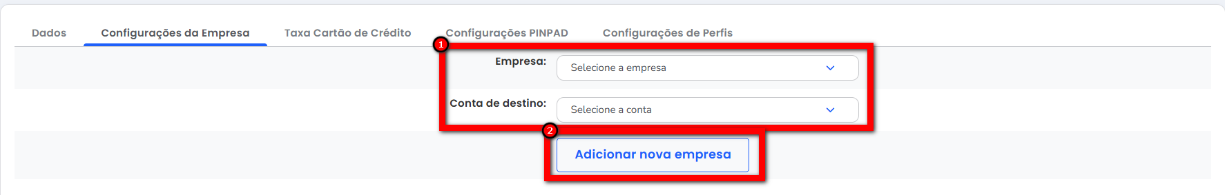 4.1. Selecione a “Empresa“, a “Conta de destino” e clique em “Adicionar nova empresa“;
