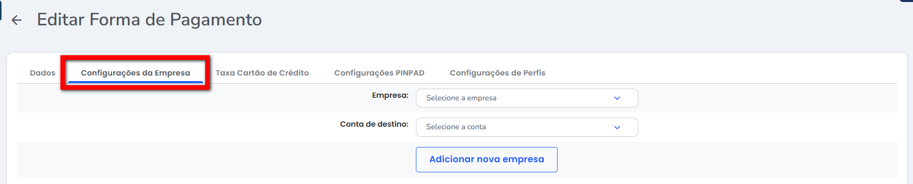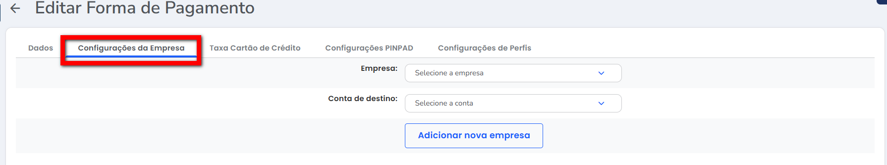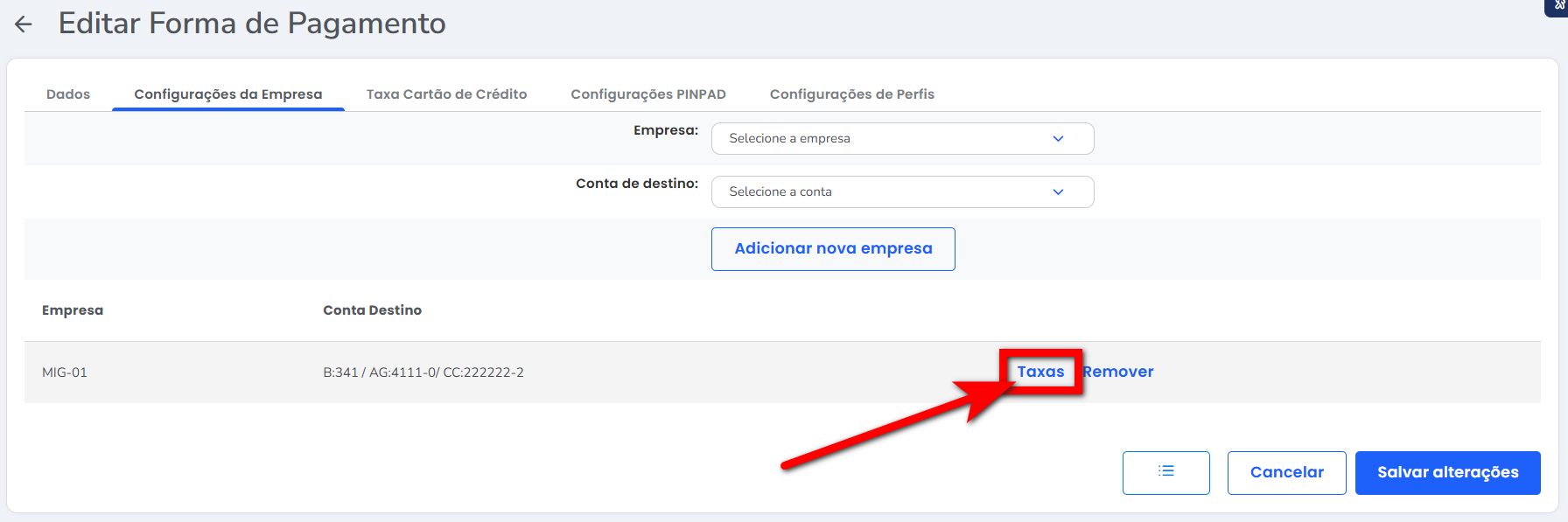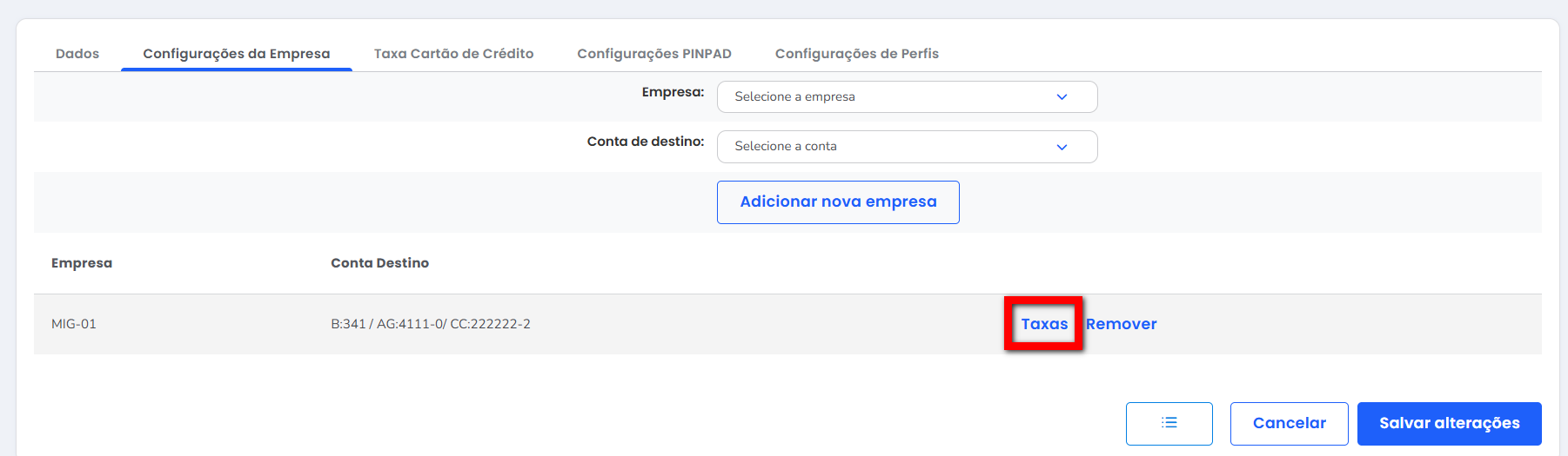Atenção: ao definir a taxa em "Configurações da Empresa" essa forma de pagamento ficará disponível para uso apenas nas empresas cadastradas.