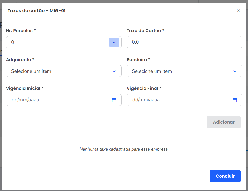 4.4. Após preencher todos os campos, clique em “Adicionar” e em “Concluir” para encerrar o cadastro das taxas;