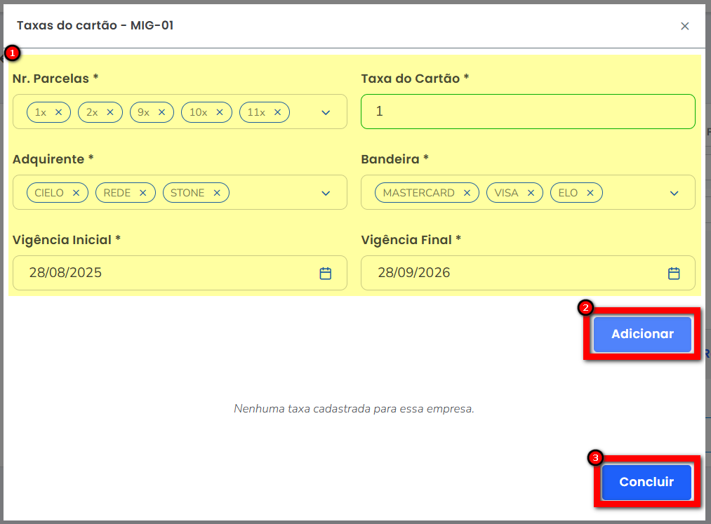 Atenção: clique em “Adicionar nova taxa” de acordo com quantidade de taxas, adquirentes e bandeiras que precisa cadastrar.
