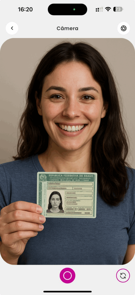 - Foto com documento: ele será orientado a tirar uma selfie segurando um documento com foto (RG ou CNH). Conforme o exemplo: