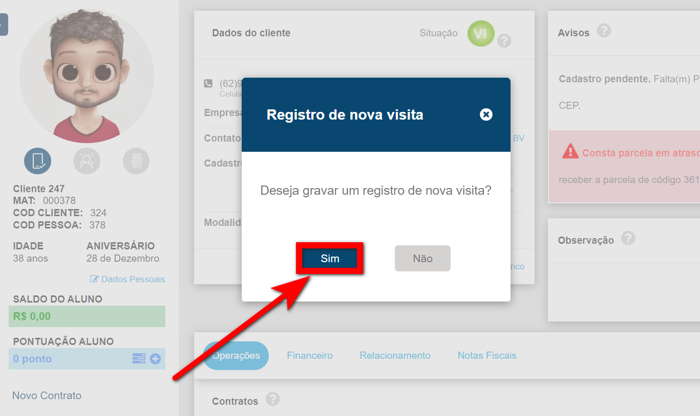3. Será apresentado este pop-up, clique em "Sim" para gravar o registro da nova visita;