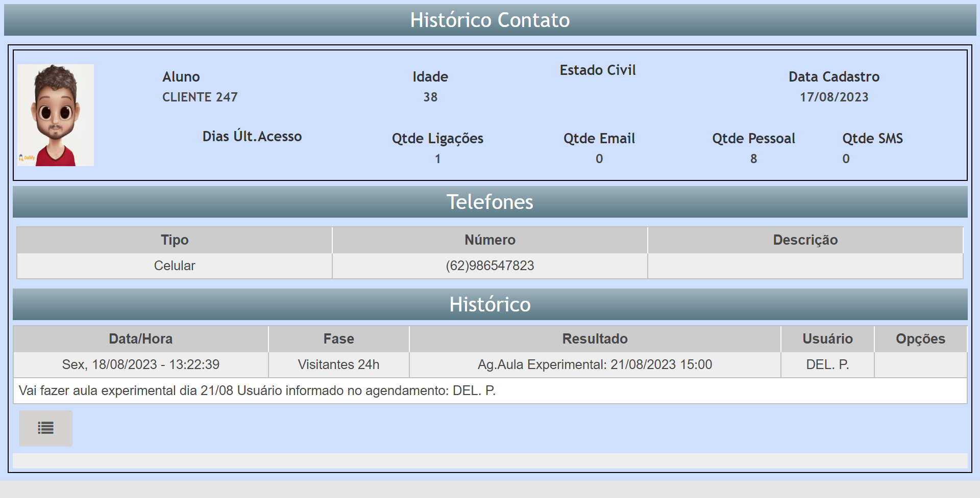 4.1. Ao clicar sobre algum resultado da listagem, é aberta uma nova tela com o histórico de contatos realizados com o aluno;