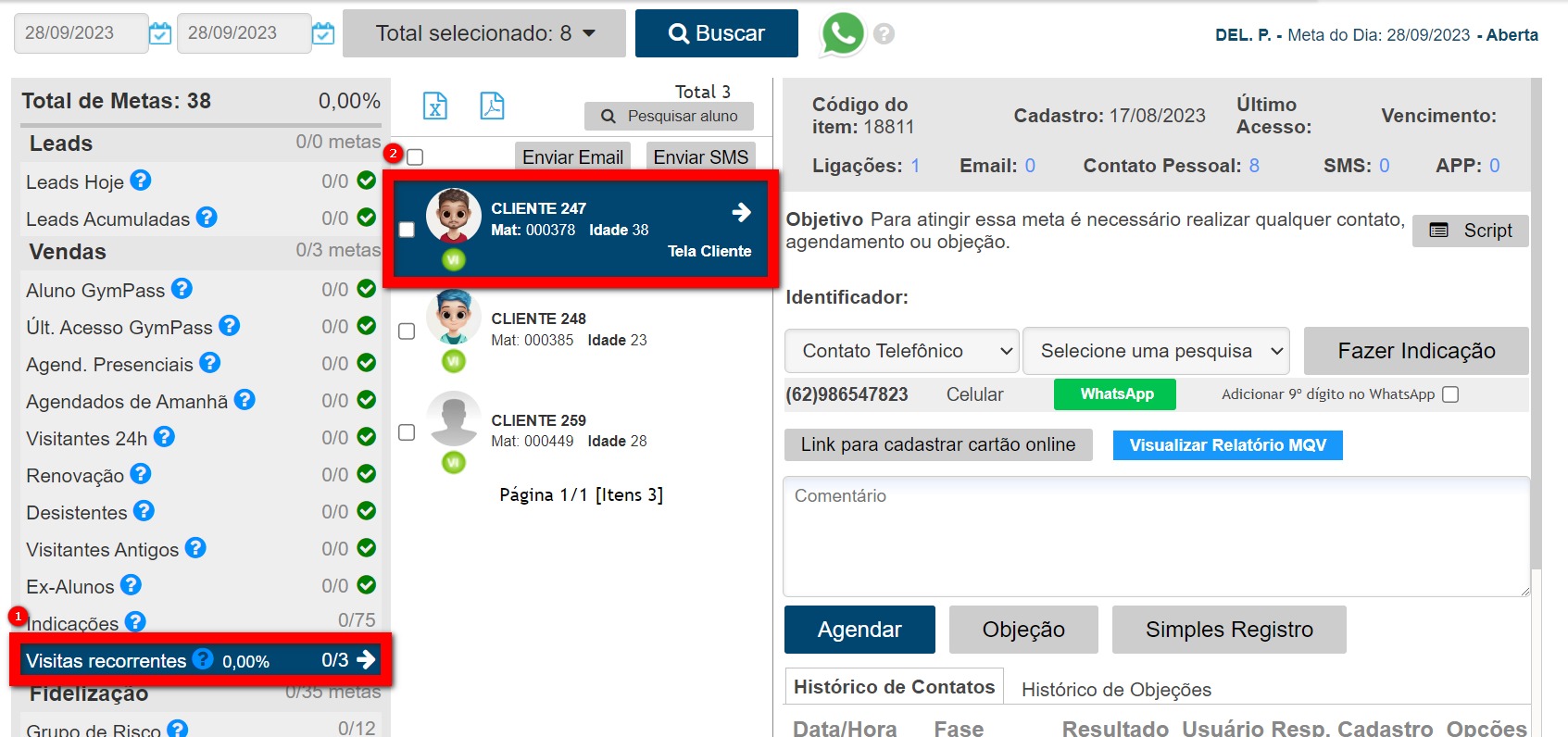 2. Procure na meta diária pela fase “Visitantes recorrentes“. Clique sobre ela e logo são apresentados os clientes que compõem essa fase. Localize e clique sobre o cliente desejado e realize o contato.