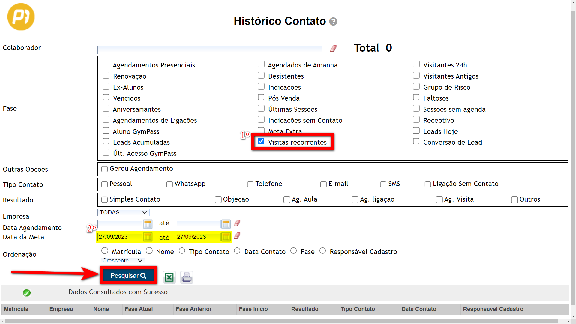3. Será apresentada esta nova tela, marque a fase "Visitas recorrentes" e no campo "Data da meta" informe o período que deseja visualizar. Por fim, clique em "Pesquisar";