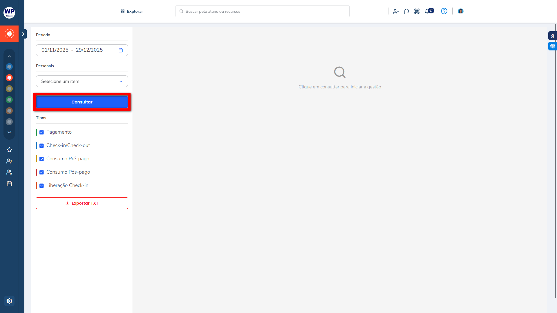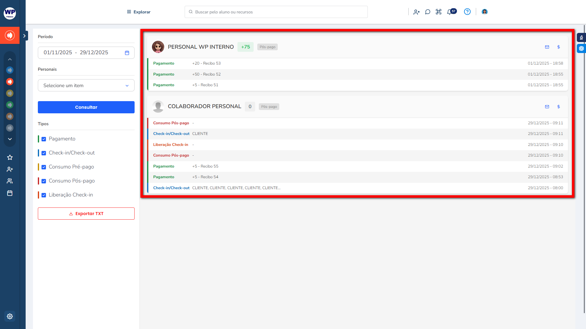 - Tipos: realize o filtro pelo tipo de evento realizado pelos personais (pagamento, check-in, check-in forçado, consumo pré-pago e consumo pós-pago);