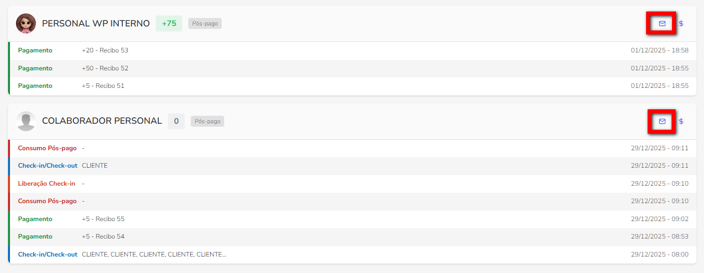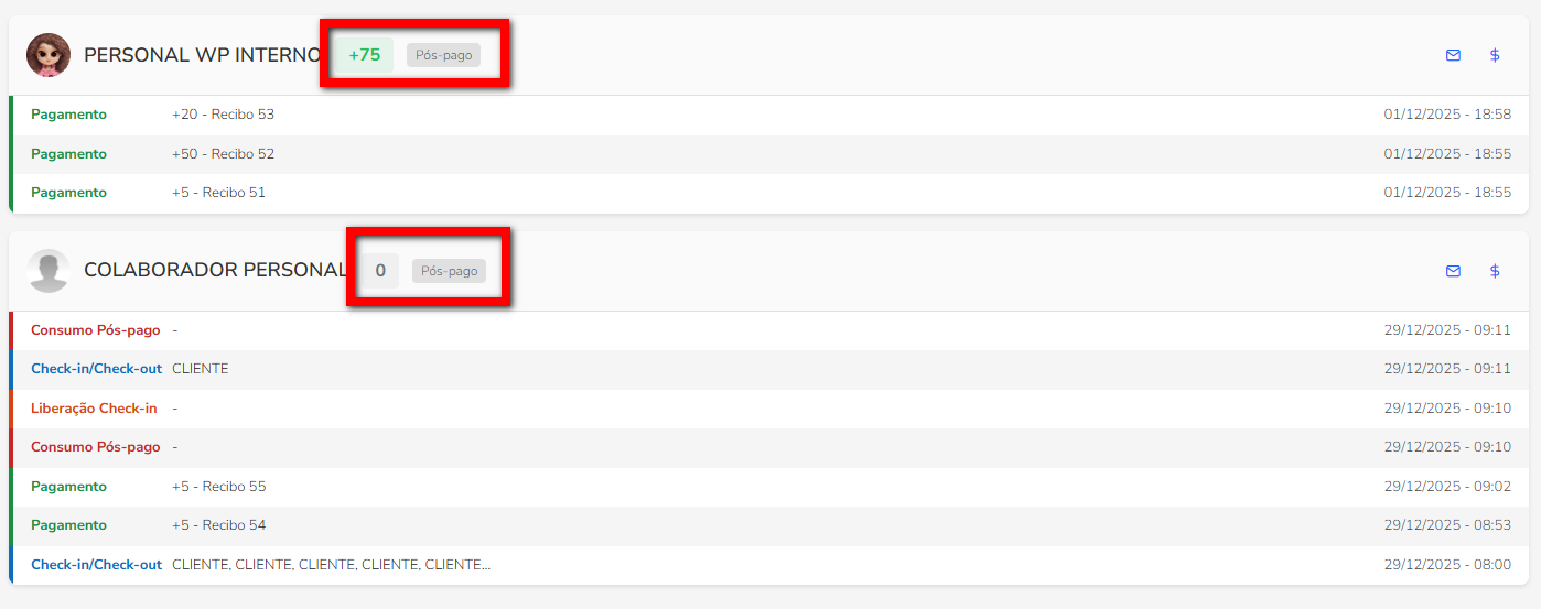 - Se for pós-pago, o número estará em vermelho e diminuirá à medida que o consumo for realizado; Observação: quando o personal não tem mais créditos a utilizar, o sistema apresenta a informação zerada e na cor cinza.