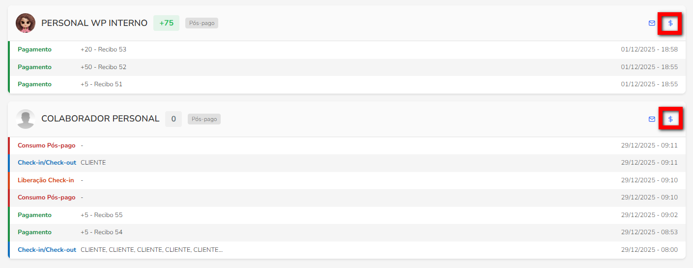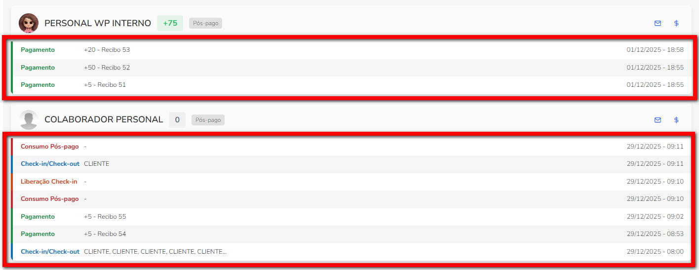 6. No centro do bloco de cada personal, você pode visualizar informações sobre as ações realizadas no sistema dentro do período consultado. Caso ele tenha atendido algum aluno, o nome do aluno também será exibido. Além disso, é possível verificar o dia e a hora de início de cada ação realizada, como check-in, check-out, pagamentos, consumo, liberação de acesso, entre outras.