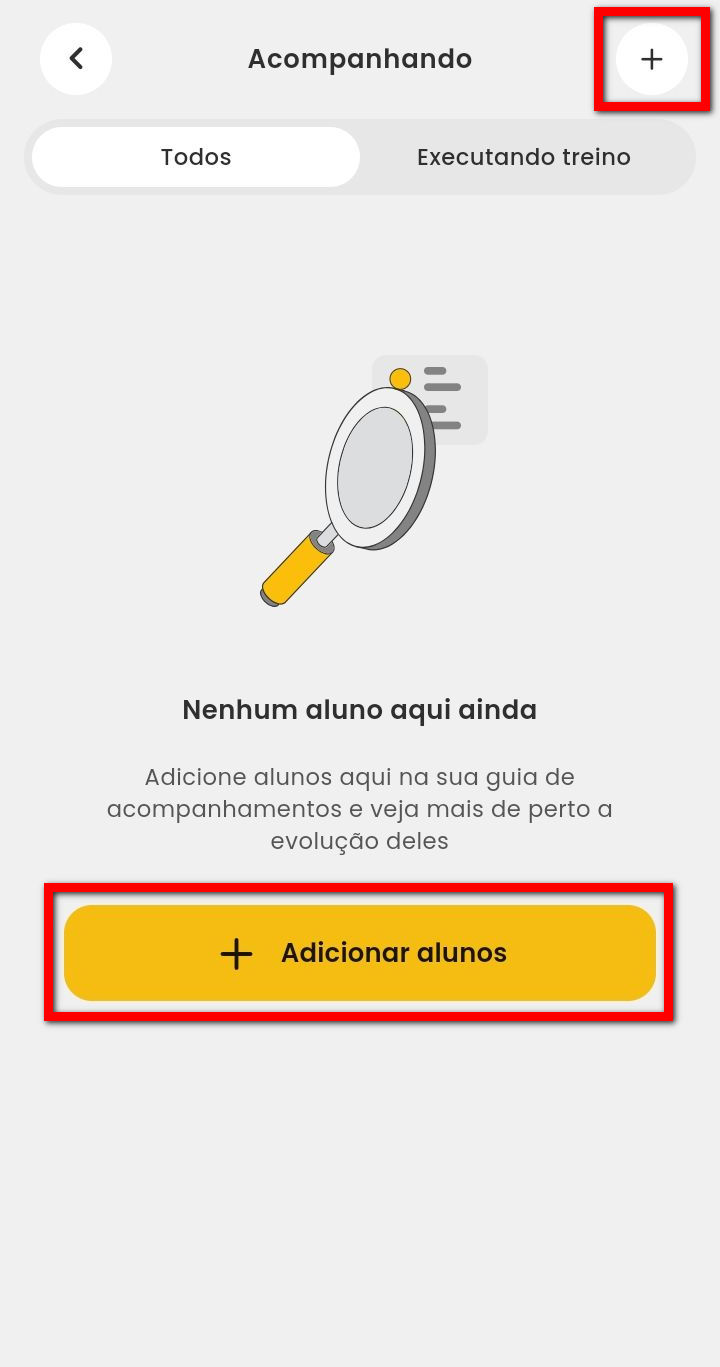 2. Na tela de Acompanhando é possível adicionar os alunos ou verificar aqueles que estão sendo acompanhados. Para adicionar alunos e realizar o acompanhamento clique no ícone localizado no canto superior ou clique no botão de “+ Adicionar alunos“;