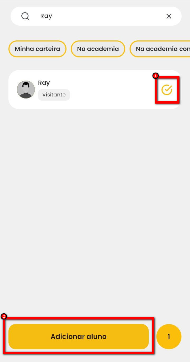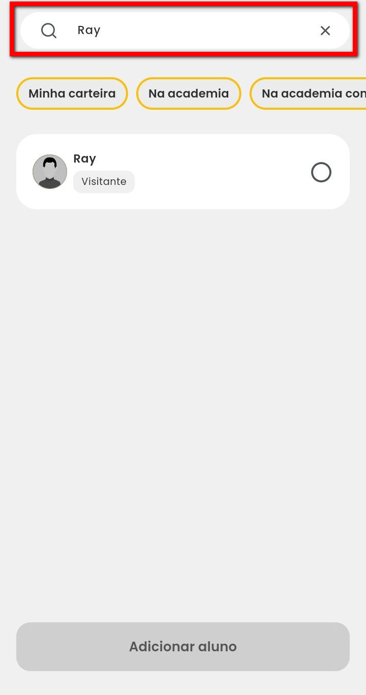 3. Em seguida, será redirecionado para a tela de adicionar aluno. Localize o aluno desejado e selecione a opção a frente do aluno;
