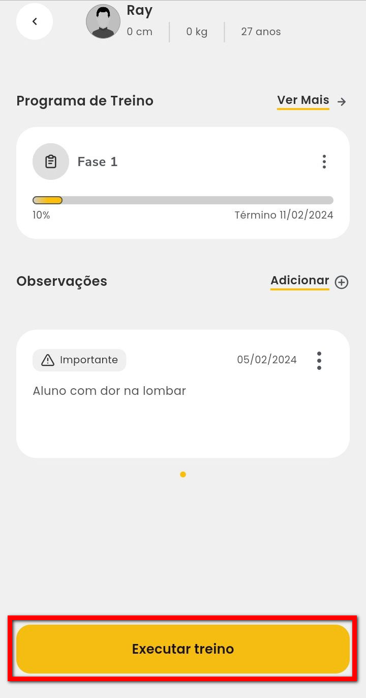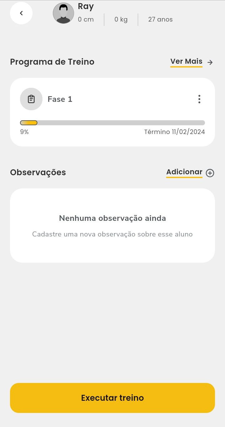 Observação: no bloco de “Programa de Treino“ você visualiza o programa de treino atual do aluno e caso deseje visualizar e/ou editar as fichas incluídas basta clicar em “Ver Mais” e realizar as edições;