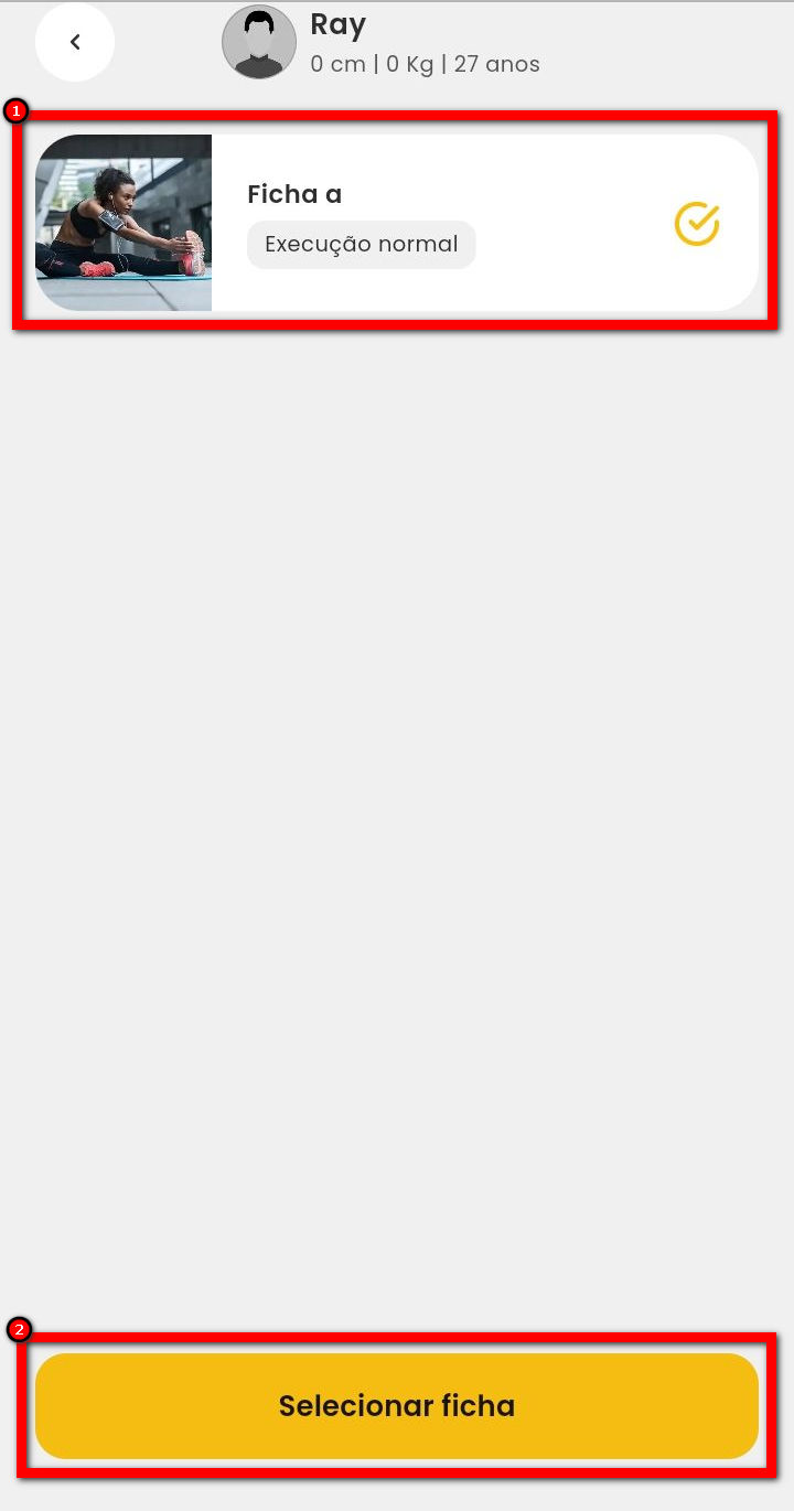 9. Será redirecionado para a tela das fichas cadastradas no programa de treino atual do aluno. Marque a opção da ficha a qual deseja realizar o acompanhamento e, em seguida, clique em “Selecionar ficha”;