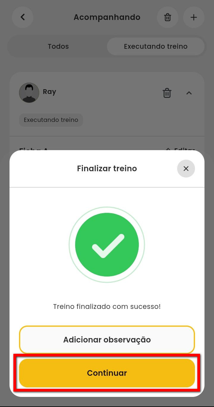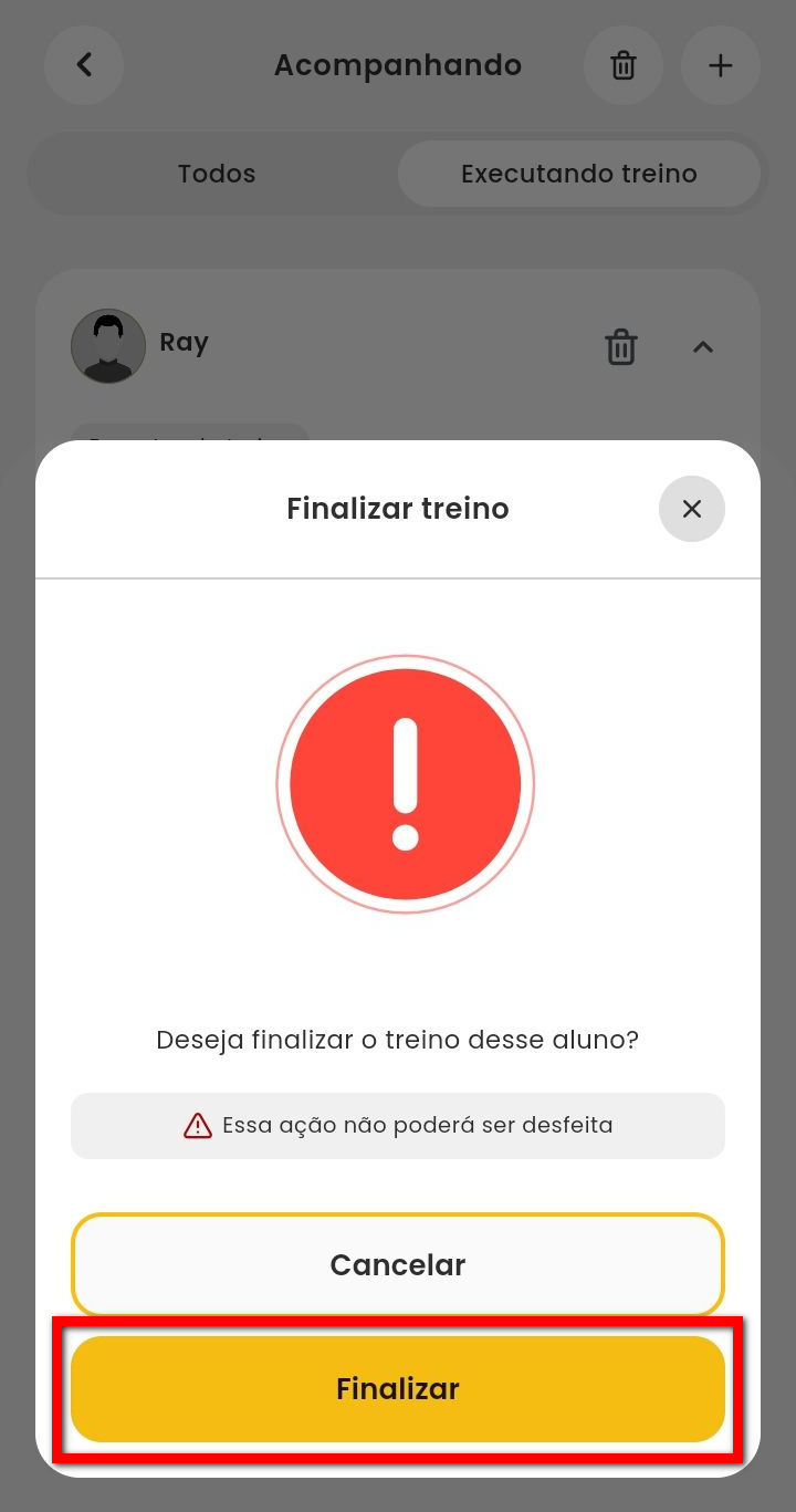 11.1. O aplicativo apresenta uma mensagem questionando se de fato deseja finalizar o treino deste aluno, clique em “Finalizar”.