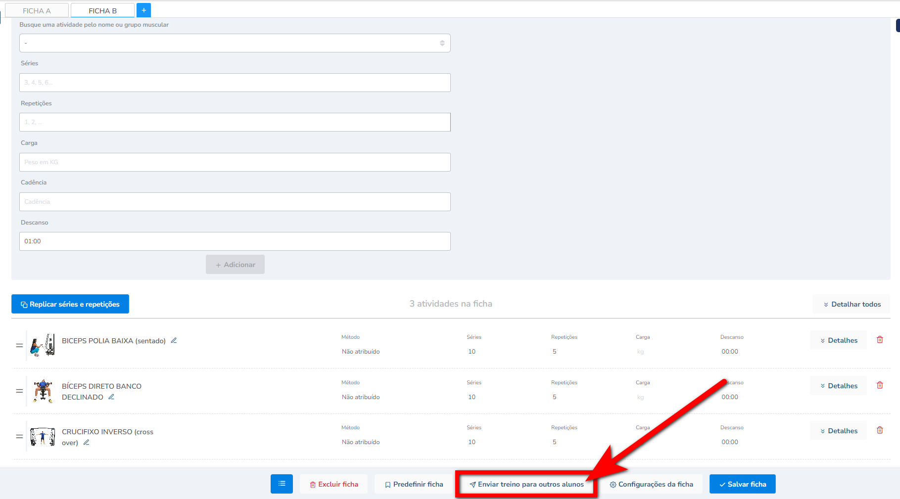 1. Assim que estiver realizando a inclusão ou edição do programa de treino do aluno, localize e clique em "Enviar treino para outros alunos";