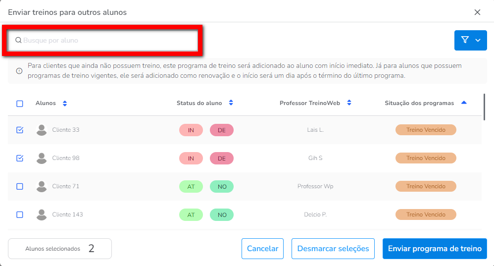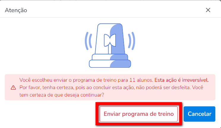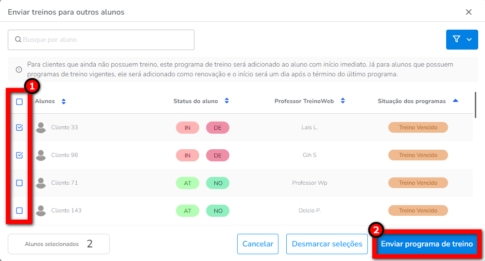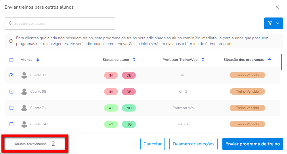 Atenção: para clientes que ainda não possuem treino, este programa de treino será adicionado ao aluno com início imediato. Já para alunos que possuem programas de treino vigentes, ele será adicionado como renovação e o início será um dia após o término do último programa.