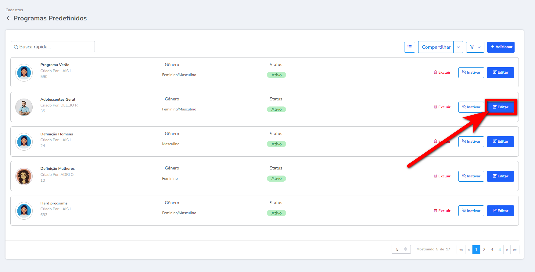 1. Ao acessar a tela de cadastro dos programa de treino, localize o programa que deseja enviar aos alunos e clique em "Editar";