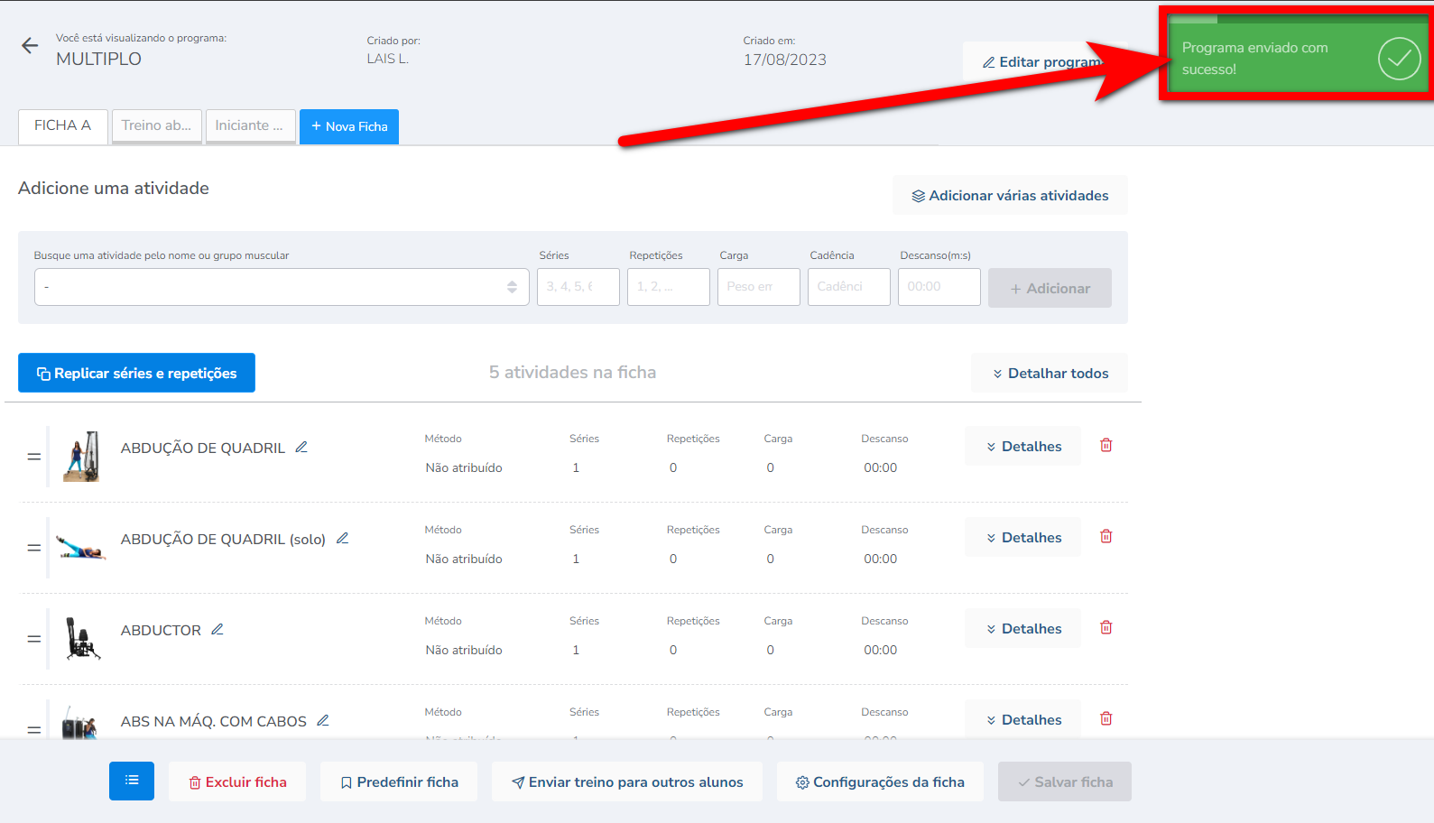 Em poucos minutos é possível encaminhar o programa de treino de um aluno em específico para vários outros alunos de uma única vez.