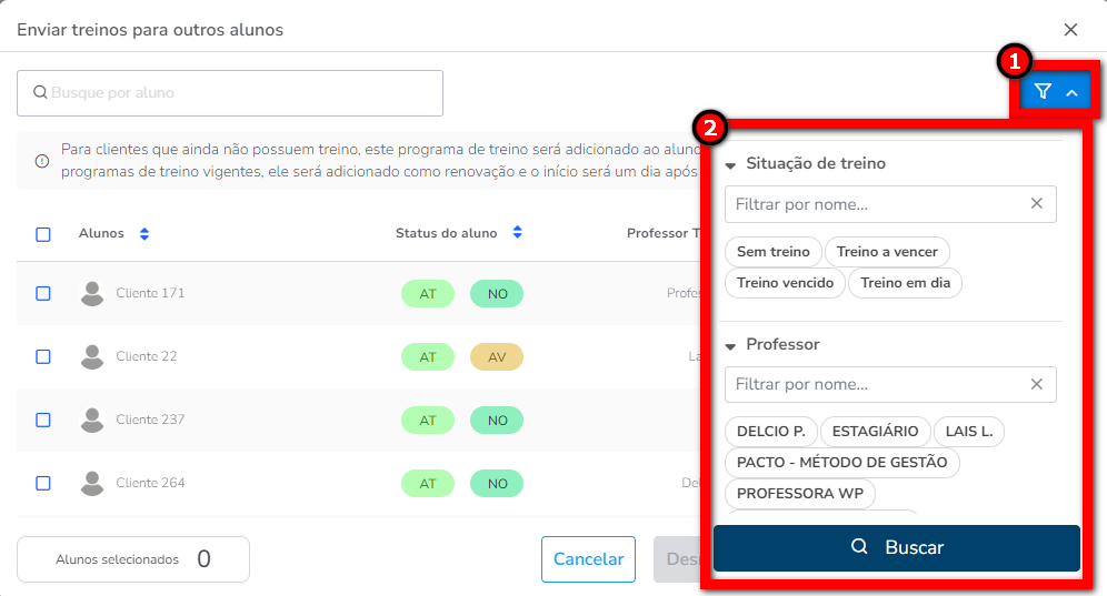 3. Pode filtrar os alunos pela "Situação do treino" ou pelo vínculo de um "Professor" em específico.
