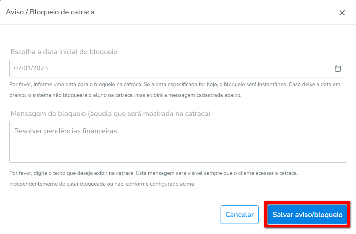 3. Informe a data do bloqueio, ou seja, a partir de que data o aluno será bloqueado, e informe a mensagem de bloqueio que será apresentada no sistema de acesso da catraca. Por fim clique em "Salvar aviso/bloqueio".