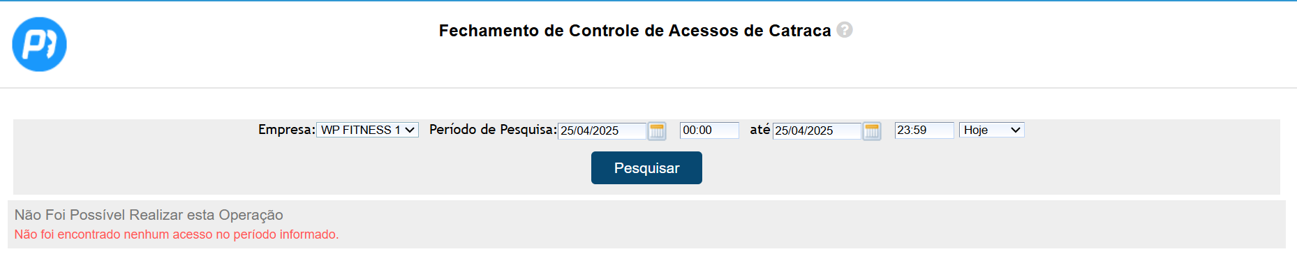 2. Ao exibir a nova página de Fechamento de Controle de Acessos de Catraca, realize os filtros como desejar;