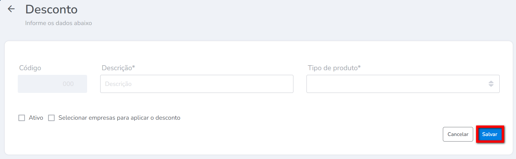 Tipo de produto: selecione dentre as opções apresentadas, para que tipo de produto deve ser disponibilizado o desconto que está sendo cadastrado;
