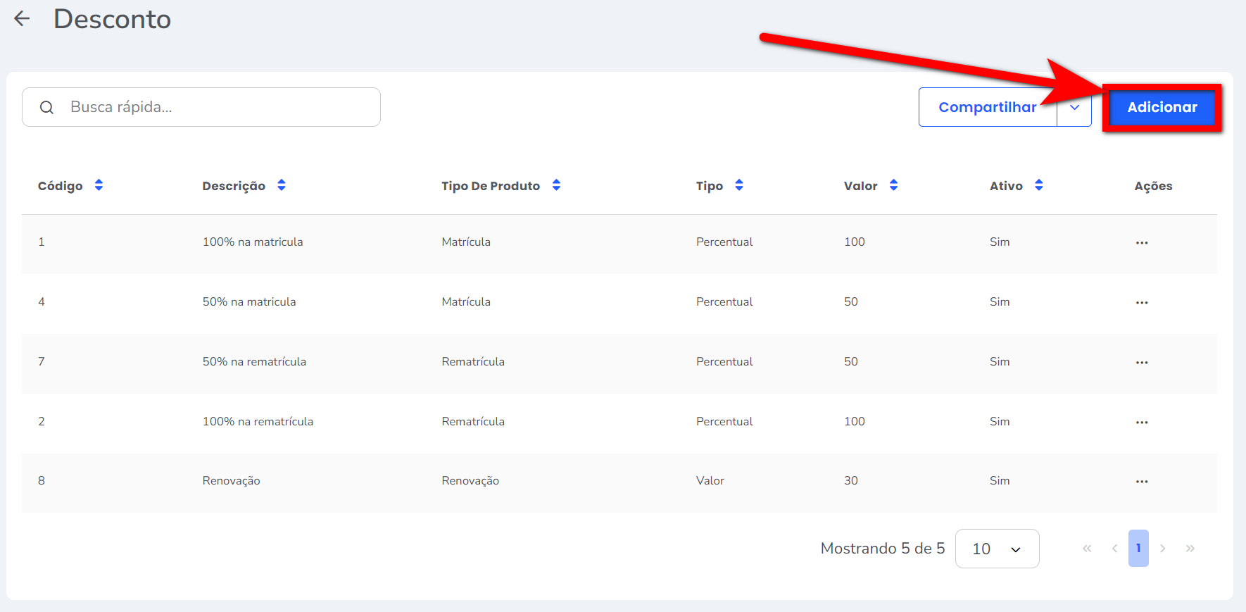2. Será apresentada a tela com a lista de todos os descontos cadastrados no sistema. Clique no botão “Adicionar”;