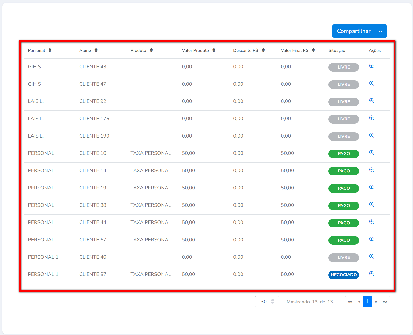 - Livre: aluno associado a uma personal, porém que não possui negociação de taxa.
