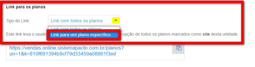 2.1. No campo "Tipo de Link", selecione a opção "Link para um plano específico".