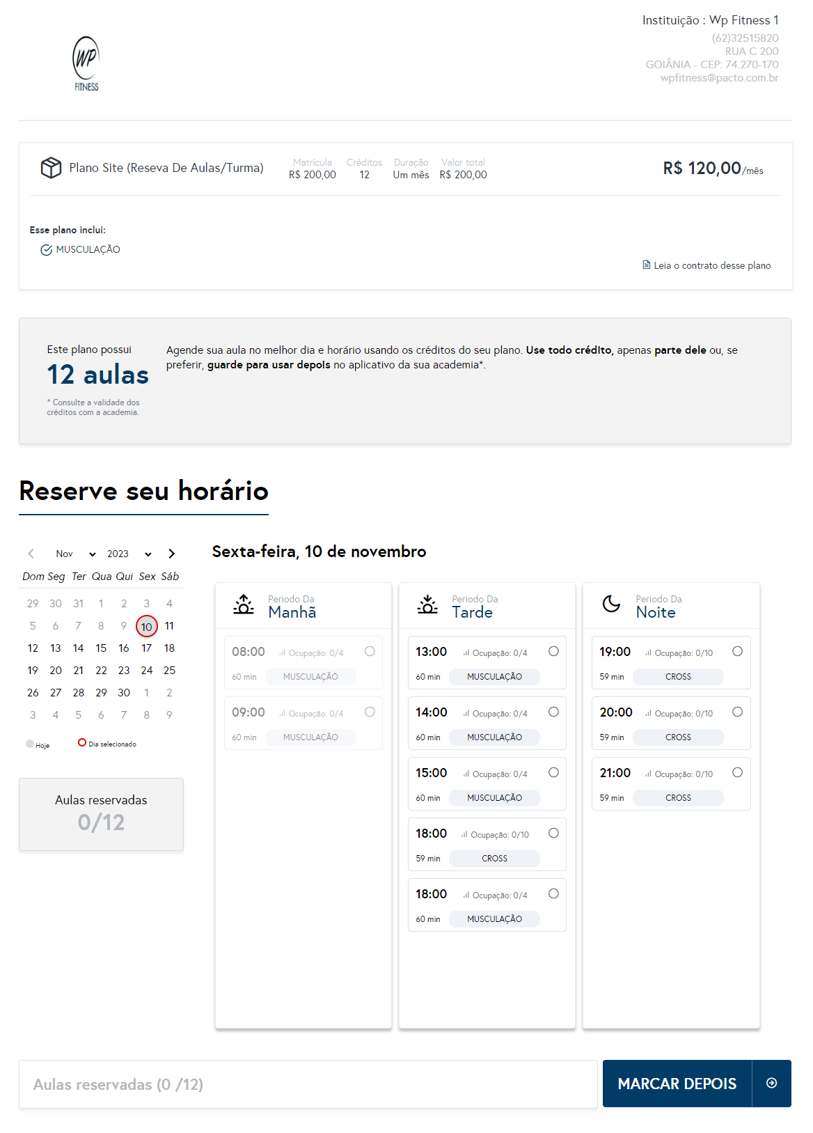 1. Ao clicar no link, o cliente será direcionado para uma página com detalhes sobre o plano que está contratando, e na parte inferior da tela terá acesso a agenda de aulas para reservar seus horários;