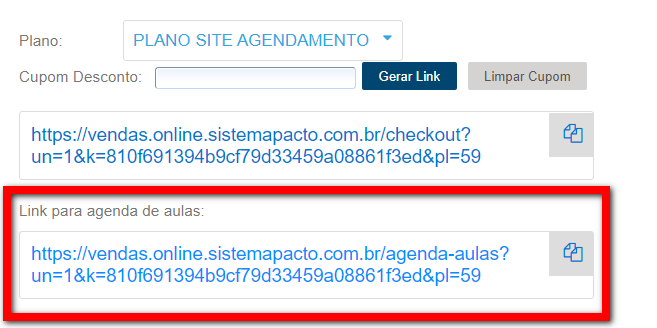 4. Feito isso, copie o link do campo "Link para agenda de aulas", e encaminhe ao seu cliente.
