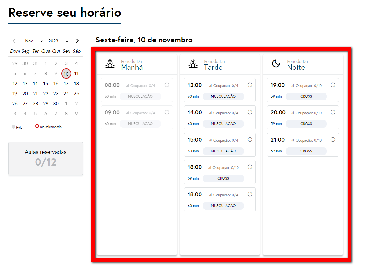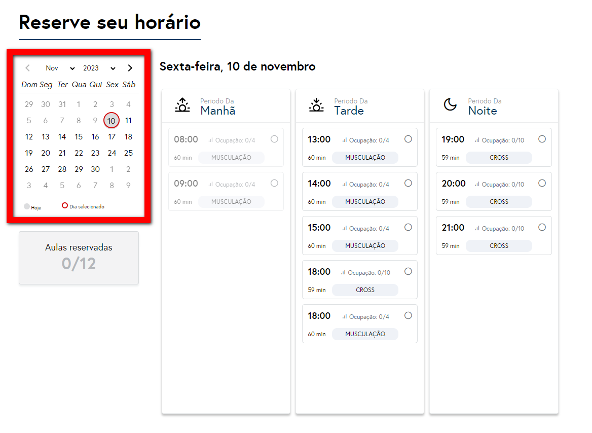 2. No campo "Reserve seu horário", será apresentado a agenda de aulas do dia que está realizando a operação, porém caso queira visualizar agenda de outros dias, basta selecionar a data em questão no calendário;