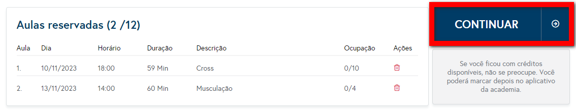 4. Após reservar todos os horários desejados, na parte inferior da tela verifique se todas as aulas agendadas estão corretas, caso não, basta clicar no ícone e excluir o horário reservado, caso esteja correto, clique em “Continuar”;