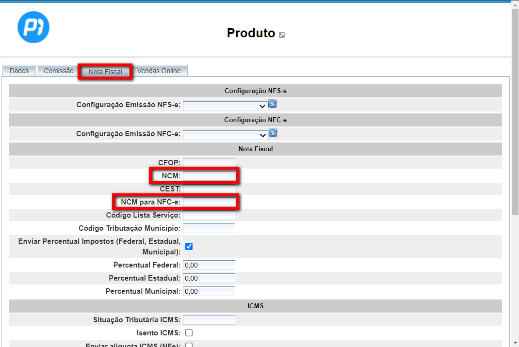 - Alíquota ICMS: campo para inserir a alíquota do ICMS incidente sobre o produto;