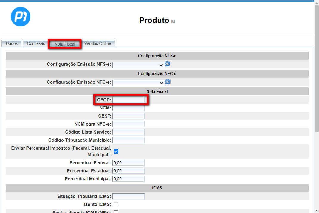 1. Primeiro realize o cadastro dos produtos desejados, e nos produtos que receberão a configuração, deve-se informar apenas o CFOP na guia "Nota Fiscal" padrão correspondente àquela categoria. Em seguida, esses produtos passarão a adotar automaticamente as configurações de imposto padrão, realizada no passo a passo a seguir; Atenção: ao realizar o cadastro do produto informe somente o CFOP.