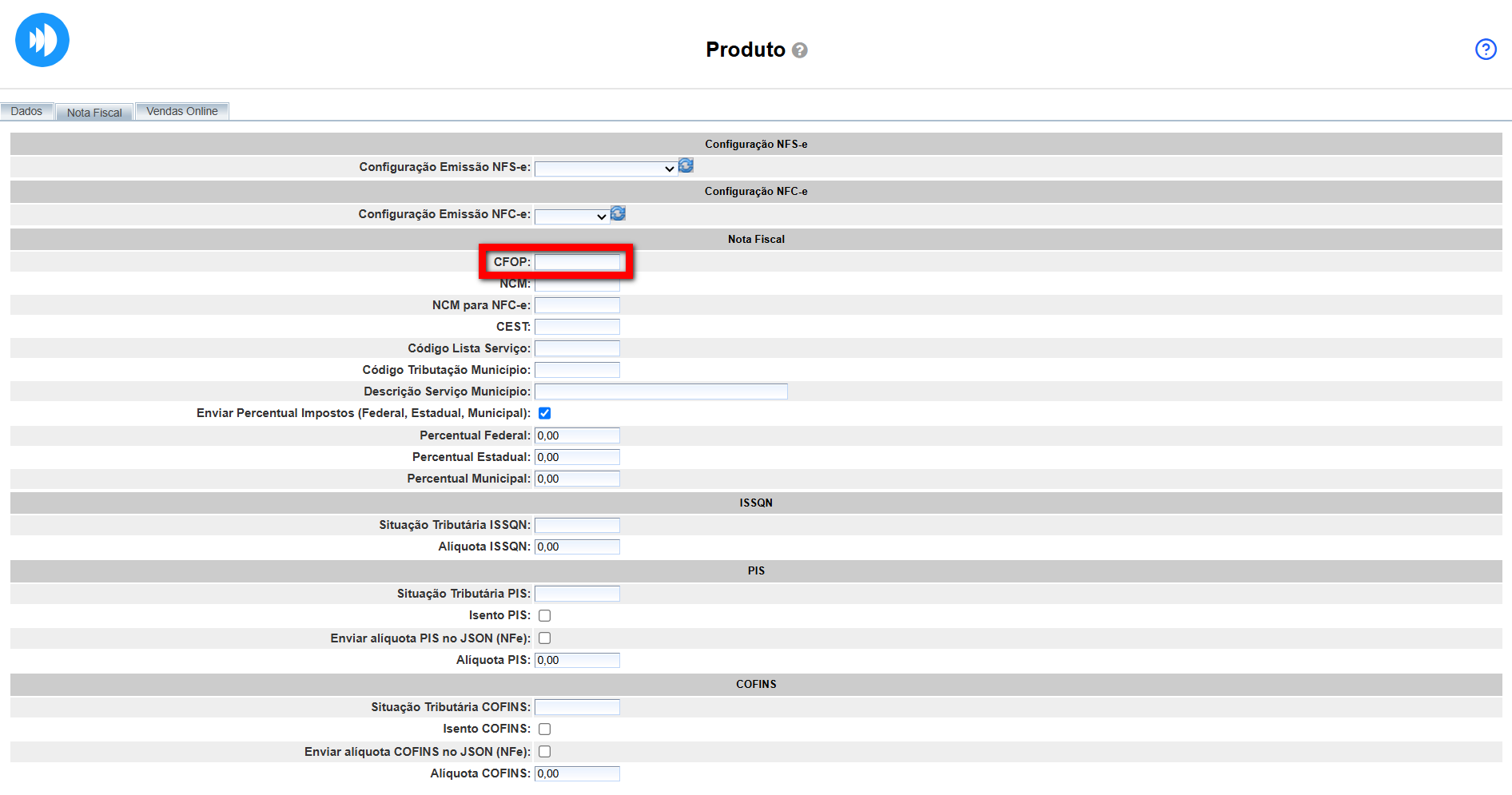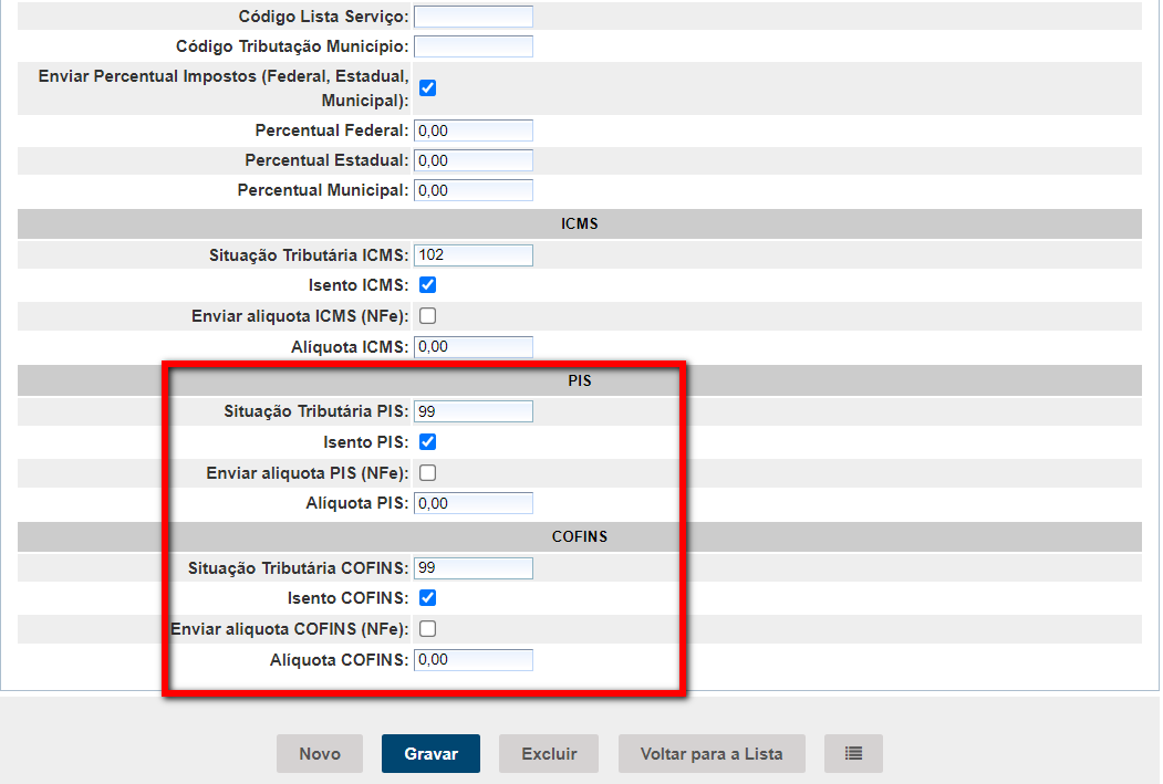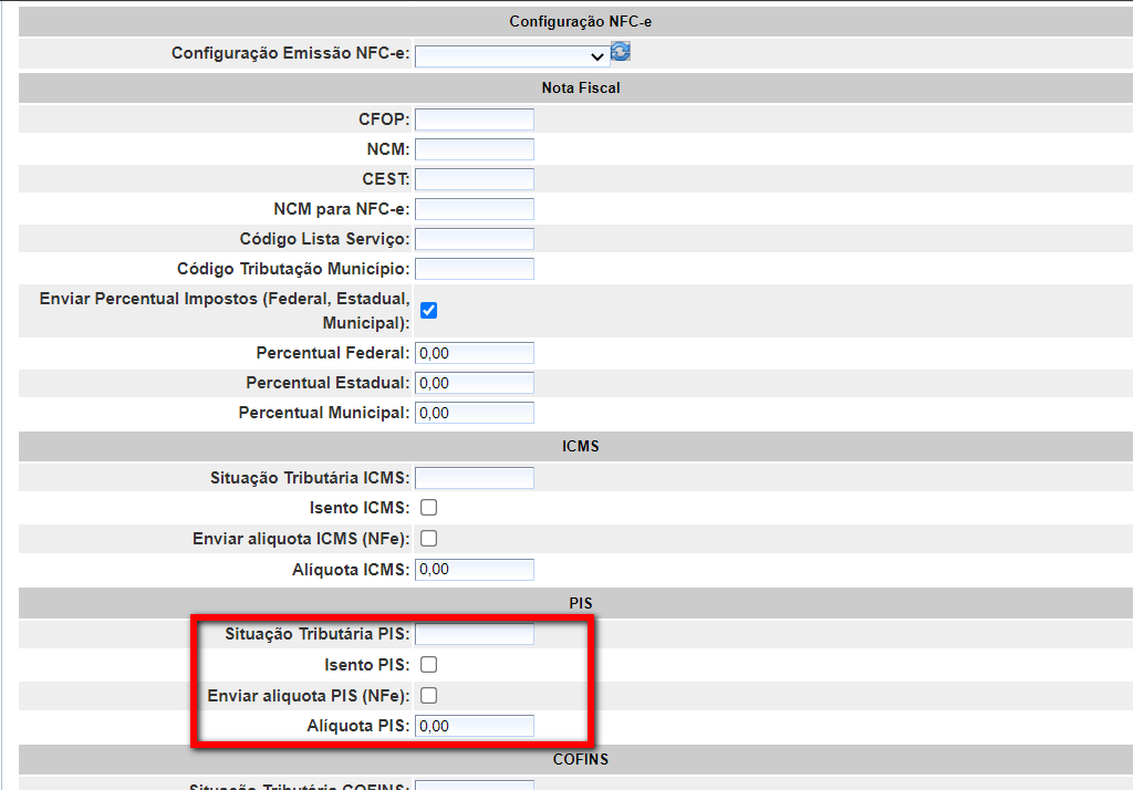 - Alíquota COFINS: campo para inserir a alíquota da COFINS incidente sobre o produto/serviço;