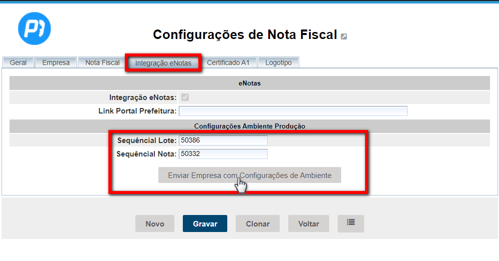 3. Na guia "Integração eNotas" você irá colocar o sequencial da sua NF, clicar sobre "Enviar Empresa com Configurações de Ambiente" e após isso grave a informação.